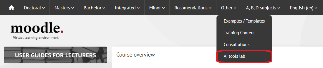 The course “AI Tools Laboratory” in the VDU Virtual Learning Environment Moodle can be found after logging into the platform under the “Other” category:
